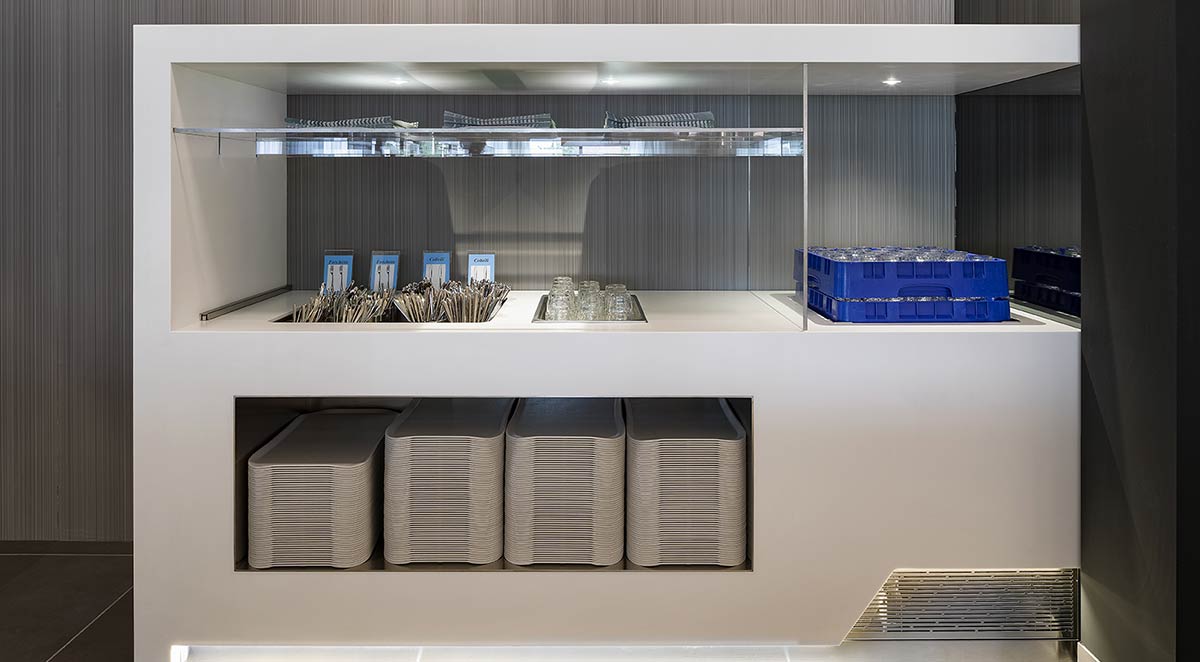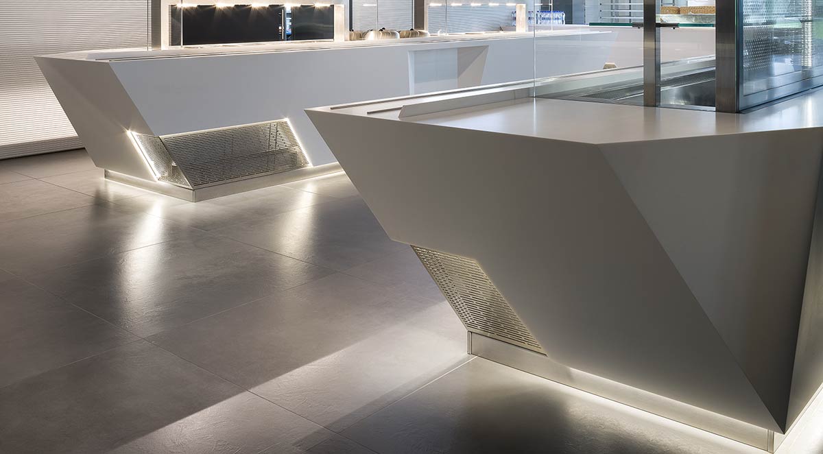 This design was conceived for an intensive use as well as with a strong aesthetic impact and Prisma was able to realise counters with a sophisticated design and Krion tops and panelling. All the technical parts, such as the air and control grating of the refrigerators, were cleverly incorporated into the design to make them a functioning part of the aesthetics.